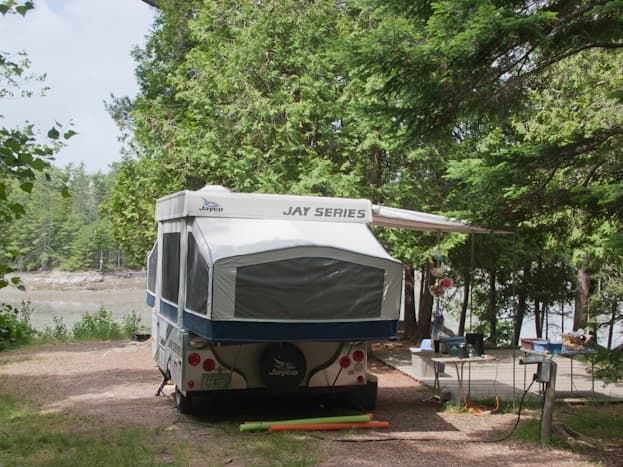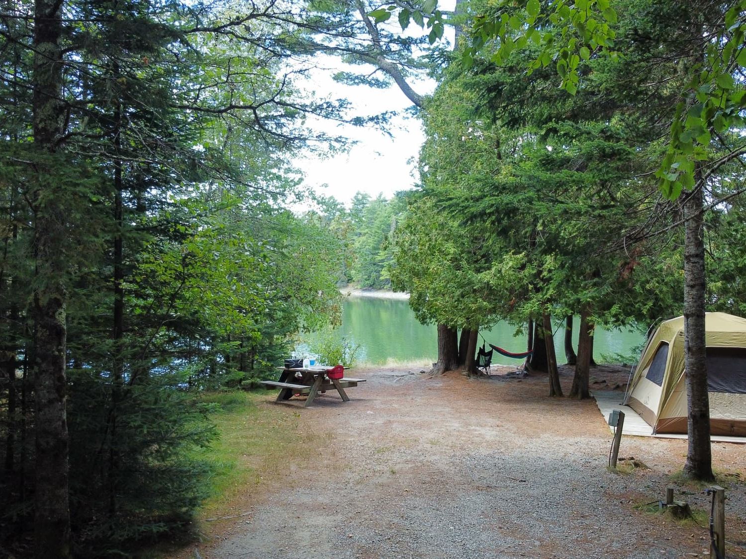 This site is accessed right from your car. The platform is 12' x 16' and the waterfront view faces west. Water and 20amp electric is available on this site. B5 is one of a handful of sites on the waterfront that can accommodate small trailers and RVs. Your walk to the A or B restroom is about a minute and a half. Maximum Occupancy: 5 people, maximum of 3 adults per site (21 and older).